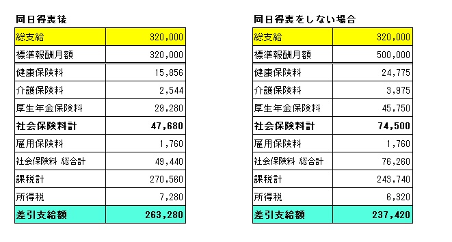4ヶ月後には随時改定により社会保険料は下がりますが、このケースでは当面、手取り額に25,000円以上の差額が生じます。